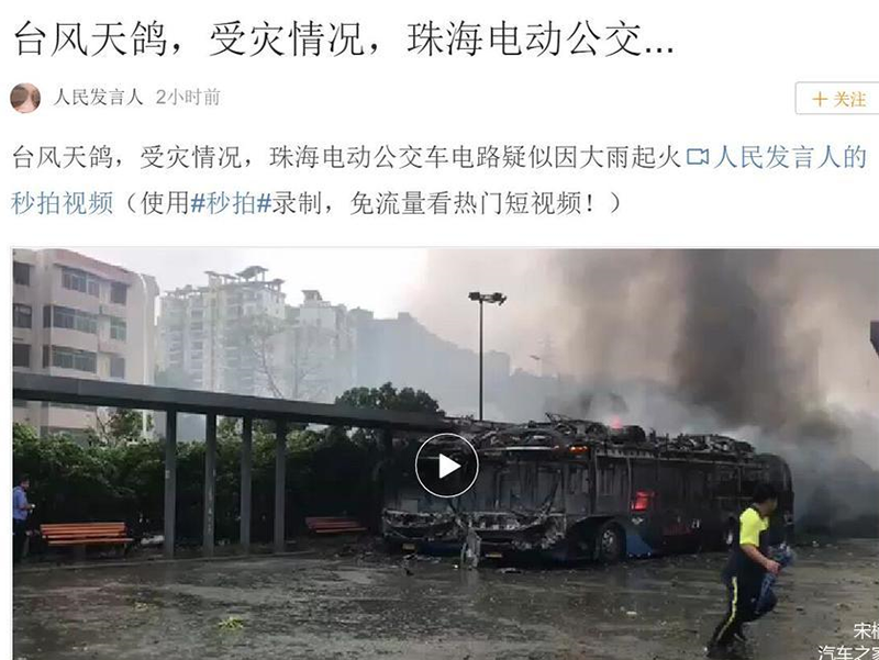 2017年8月23日,微博用戶@人民發(fā)言 人上傳了一條視頻,其內(nèi)容為: “臺風天鴿,受災(zāi)情況,珠海電動公交車電路疑似因大雨起火”。